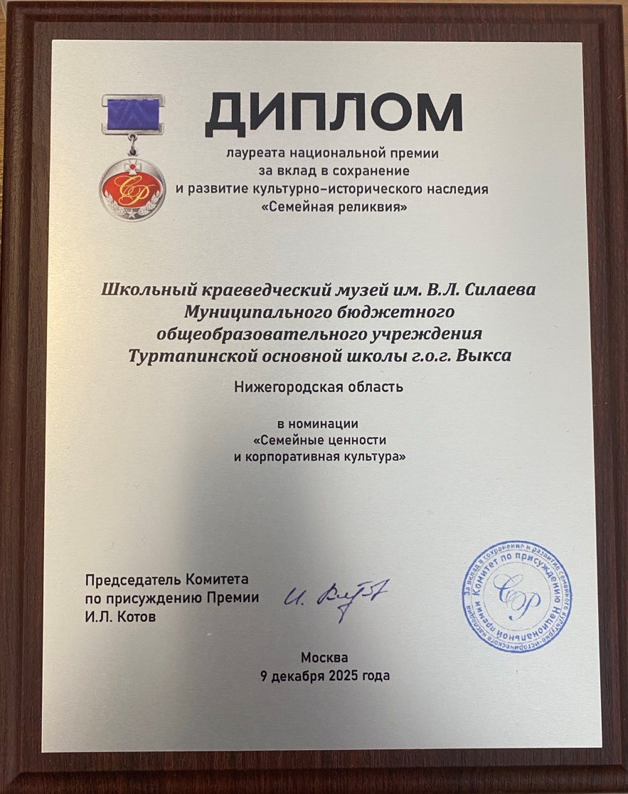 В номинации «Семейные ценности и корпоративная культура» победителем стал школьный краеведческий музей имени В. Л. Силаева Туртапинской школы.