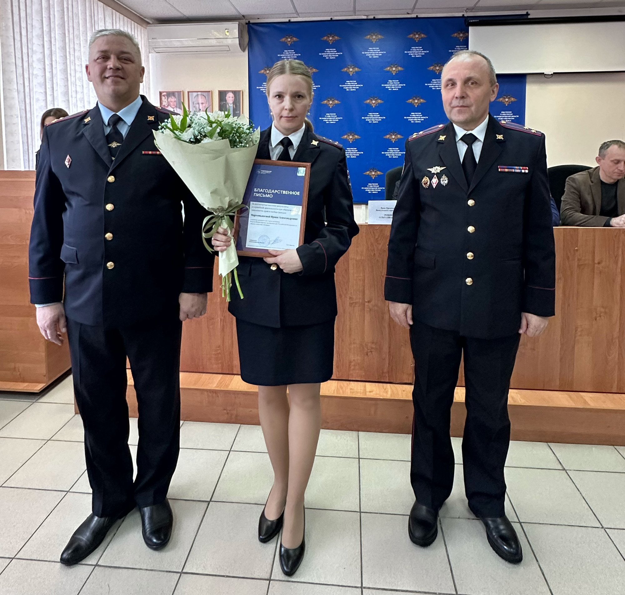 В мероприятии приняли участие начальник ОМВД России по г. Выкса полковник полиции Валерий Владимирович Илюшин, руководители подразделений и служб, а также личный состав ОМВД, начальник УРЛС ГУ МВД России по Нижегородской области полковник полиции Лохин Владимир Григорьевич, заместитель главы местного самоуправления г. о. г. Выкса Орлов Дмитрий Александрович, Выксунский городской прокурор старший советник юстиции Лобанов Евгений Сергеевич, временно исполняющий обязанности председателя Выксунского городского суда Рощина Ольга Ивановна.