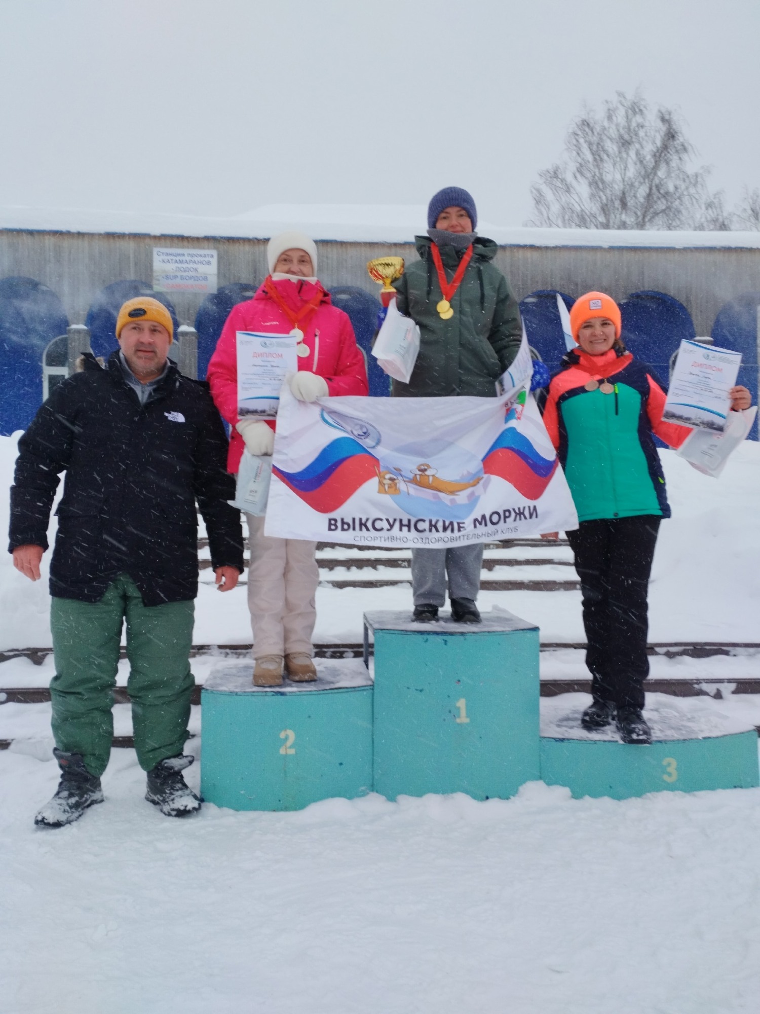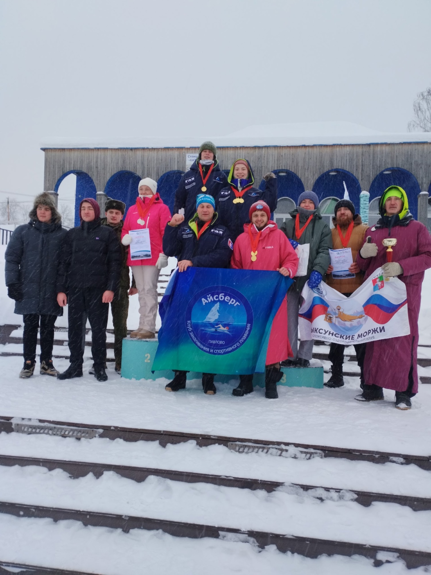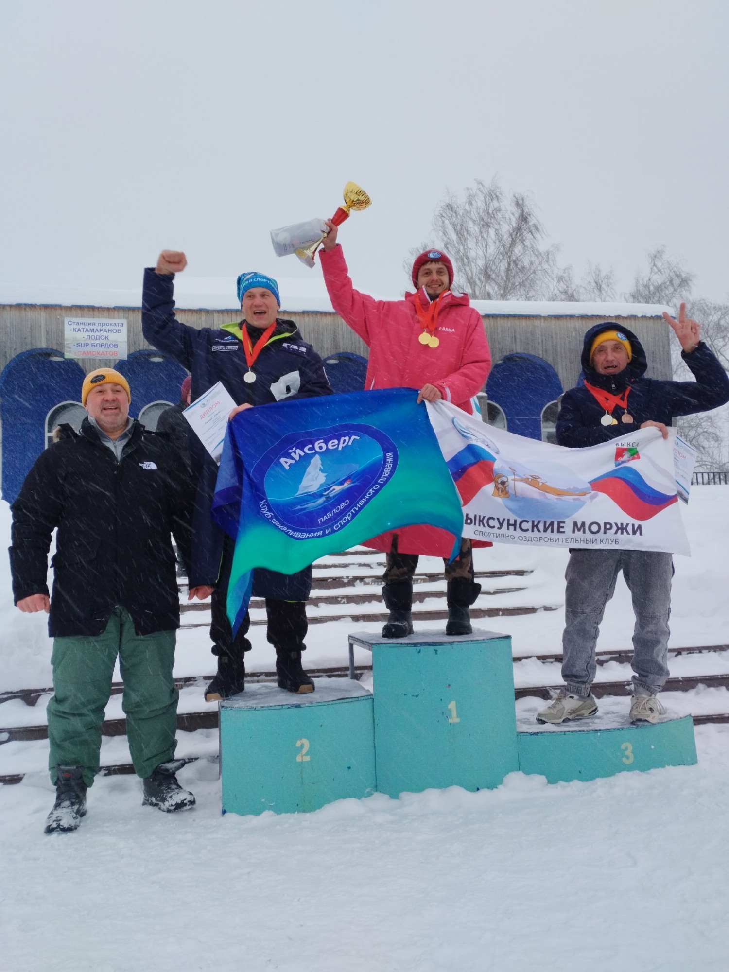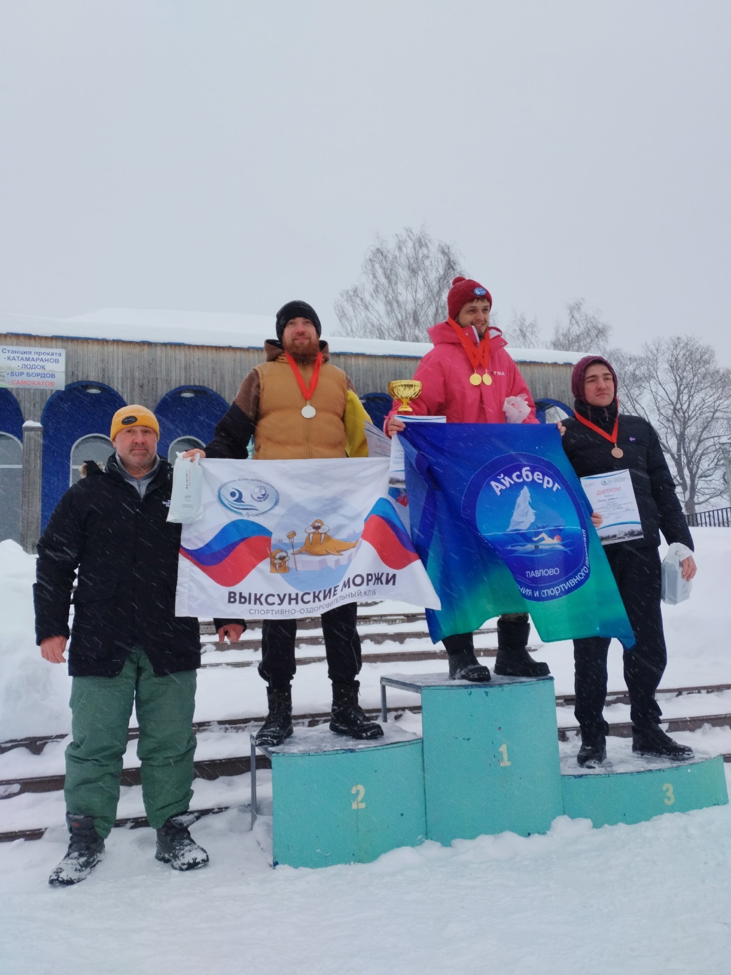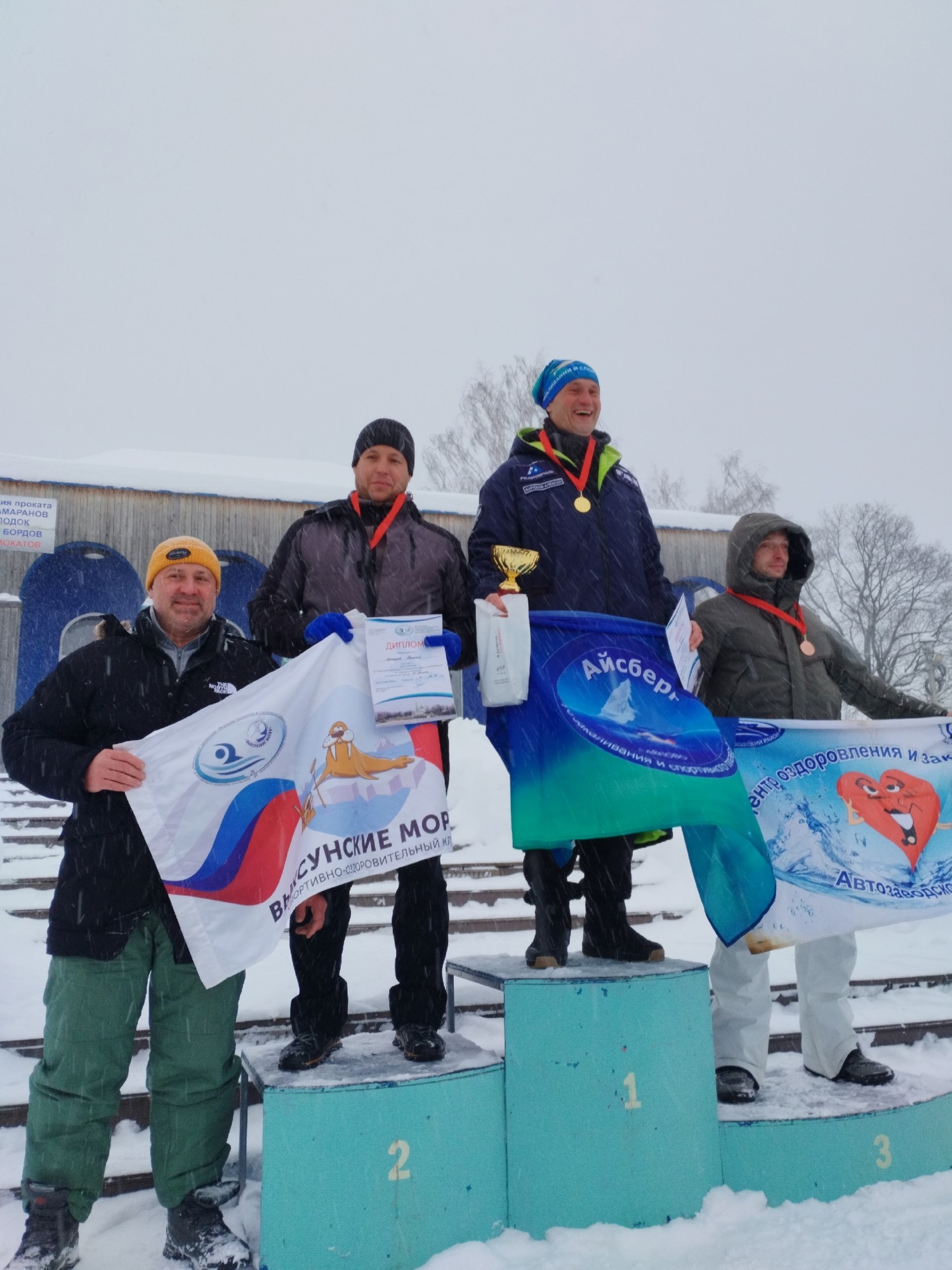В эстафетных заплывах: первое место — команда «Айсберг» (г. Павлово), второе — команда из Кстово, третье — «Выксунские моржи».