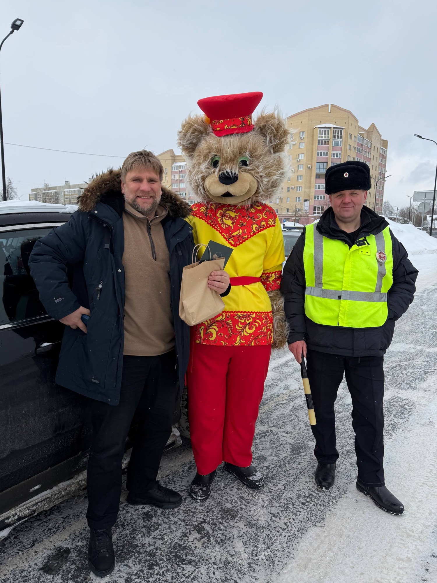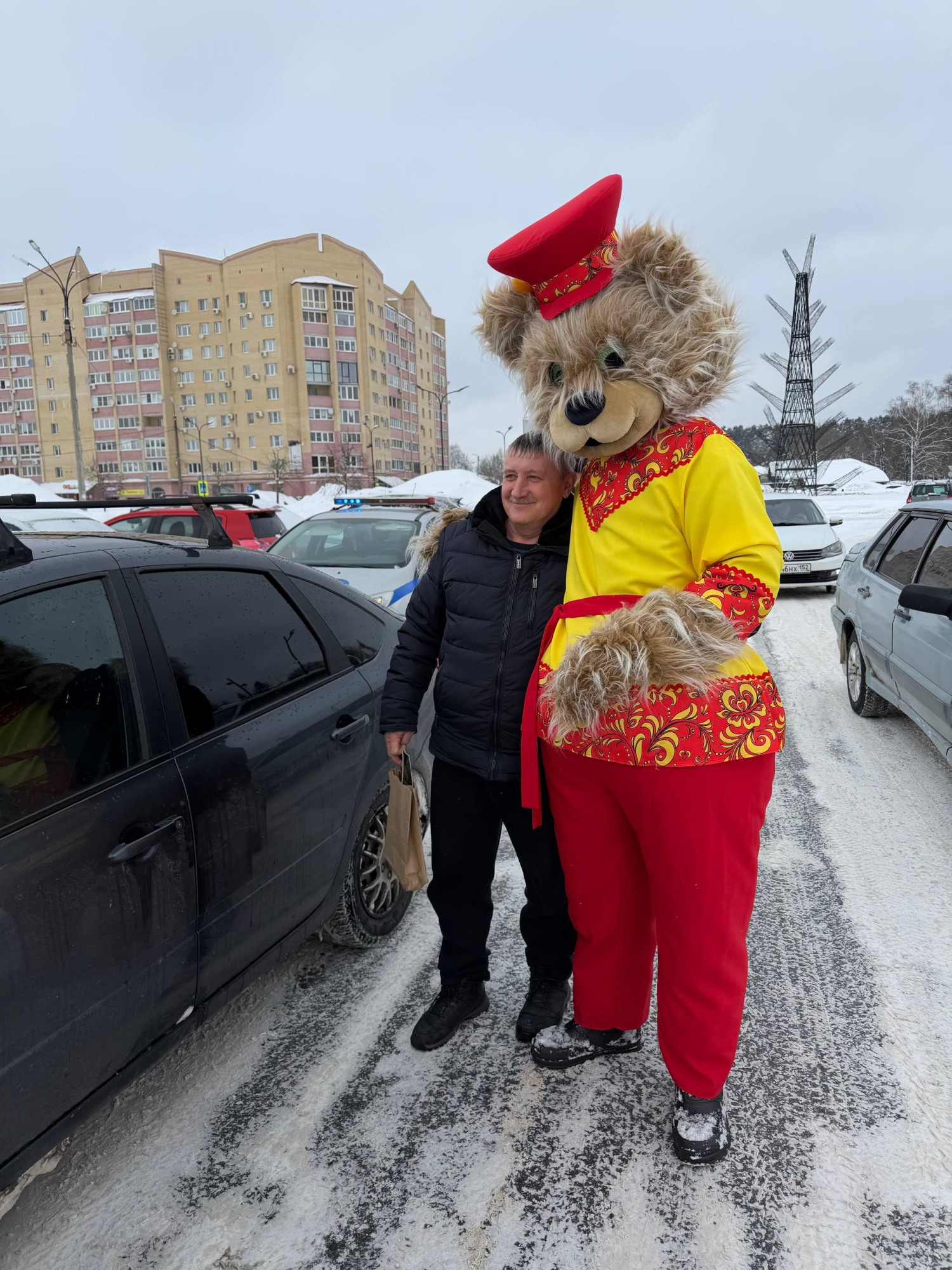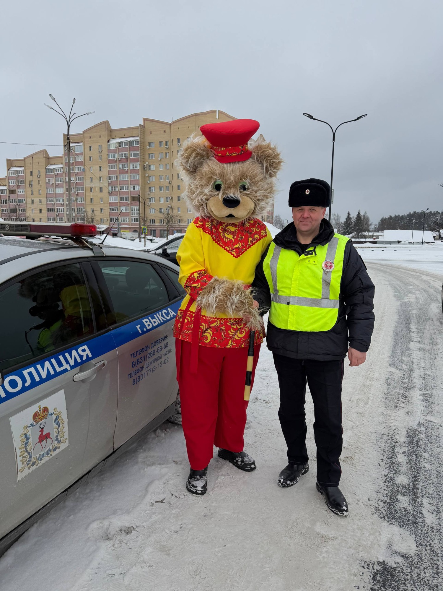 В преддверии Дня защитника Отечества сотрудники Госавтоинспекции г. Выкса с русским мишкой Потапычем поздравили водителей с наступающим праздником.