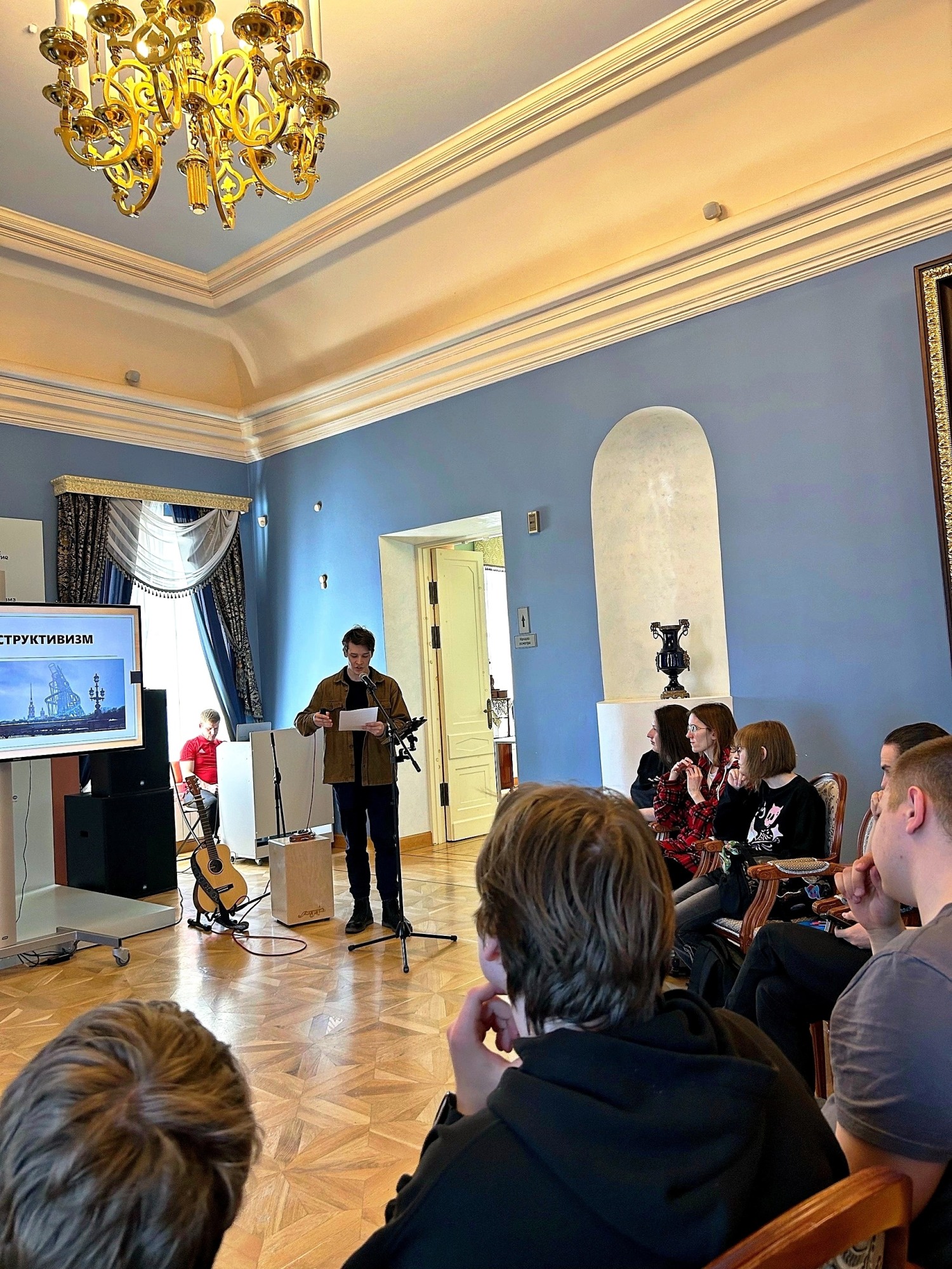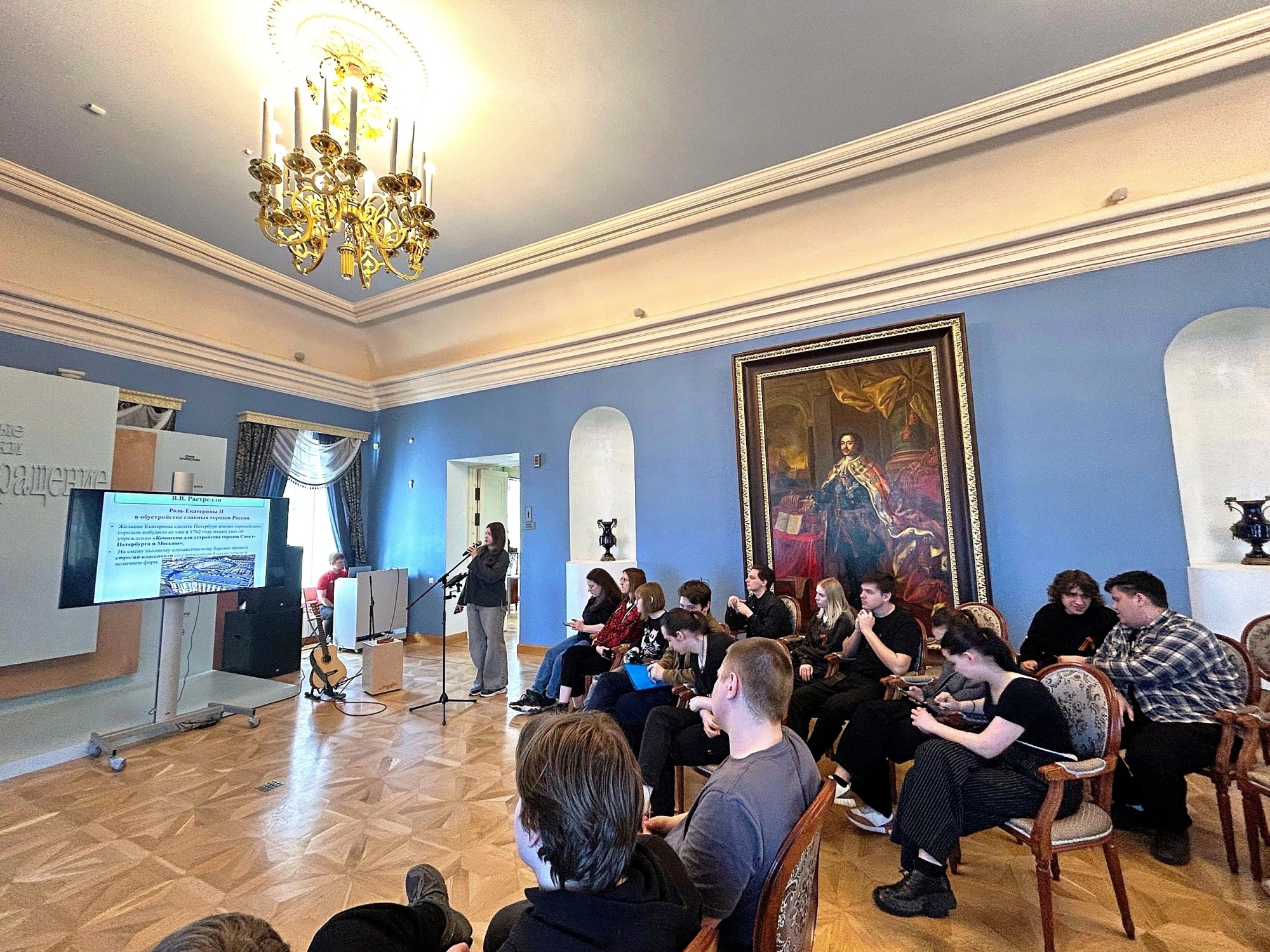 Затем участники переместились в Петровский зал, где сами выступили в роли экспертов. Студенты Иван Чичеев, Алина Абушева, Виктория Уланова и Юрий Трофимов представили своё видение архитектурных эпох: от готики и классицизма до конструктивизма и постмодернизма. Ребята показали, как менялись стили и как архитектура отражает ценности своего времени.